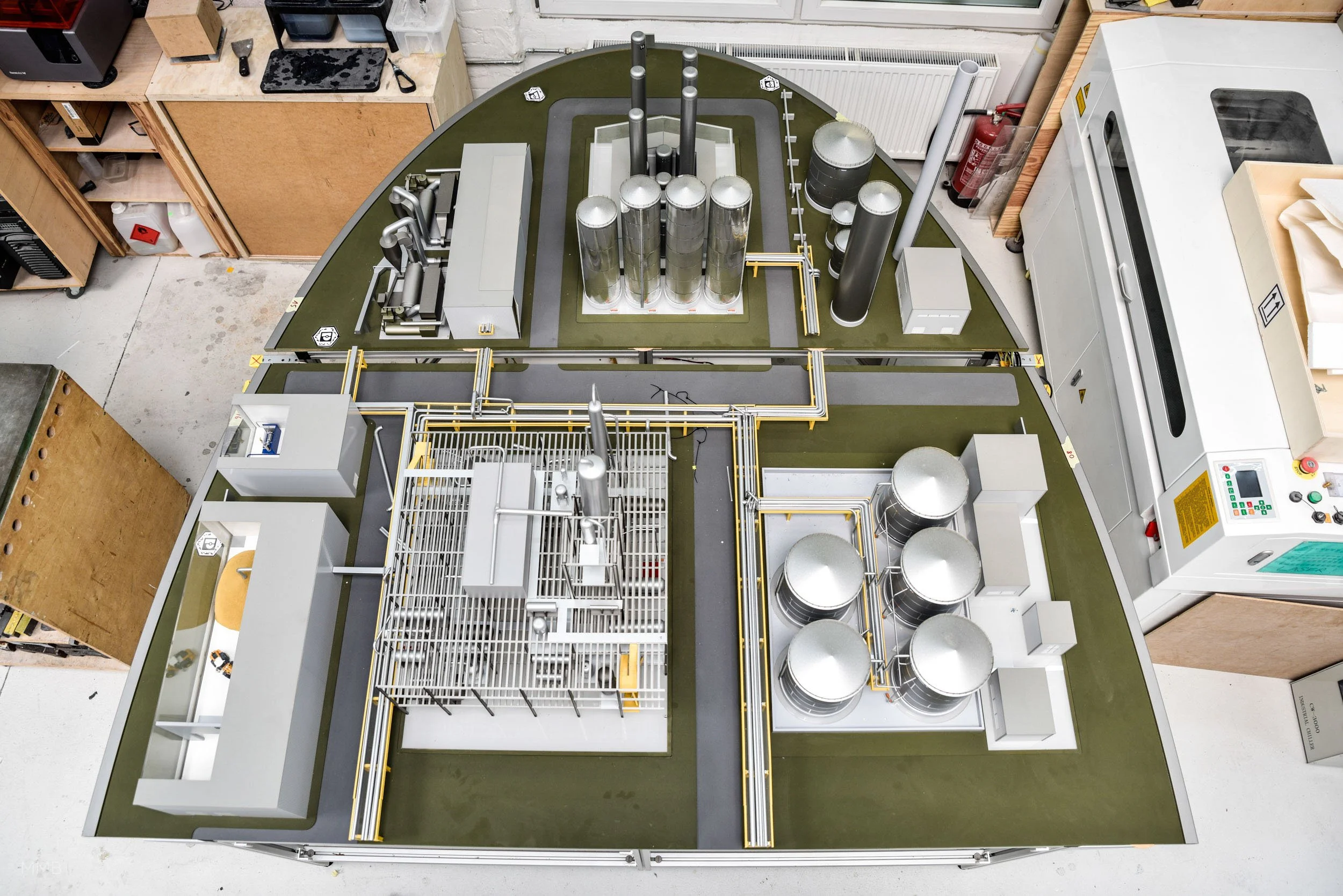 Bioethanol-Prozessanlage mit Augmented Reality-Ebene für Phoenix Contact. Im Modell befinden sich mehrere Minikameras, deren Perspektiven die Betrachtenden über ein Tablet einnehmen können. In der AR-Ebene werden zusätzliche Informationen durch Animationen gezeigt.